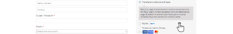 9.- Una vez ya llenado todos tus datos y revisado tu pedido escoge tu MÉTODO DE PAGO (Transferencia bancaria, pago con tarjeta de crédito ,PayPal)