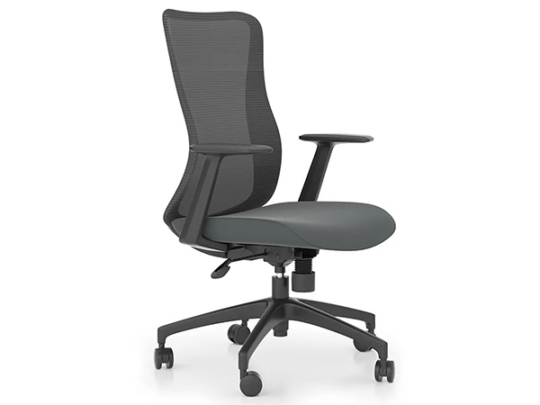 RESPALDO Y DESCANSA BRAZOS: Marco de polipropileno color negro, tapizado en malla 100% poliéster en color gris. Descansabrazos fijos en forma de “T”, fabricados en inyección de polipropileno en color negro.