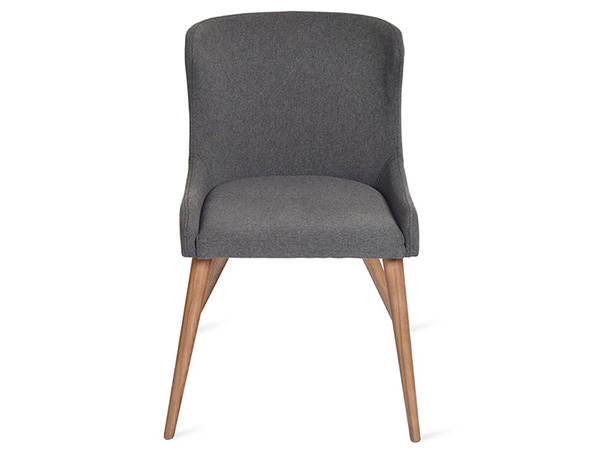 Silla tapizada en tela tipo lino con base de metal apariencia madera.
