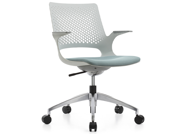 - Asiento y respaldo en una sola pieza de polipropileno color gris, con curvatura ergonómica y perforación decorativa.