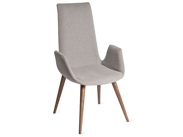 Silla tapizada en tela con base de madera en color nogal.