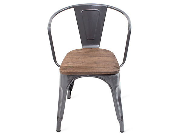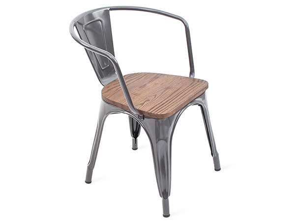 Silla de metal color gris con asiento de madera de olmo color chocolate.