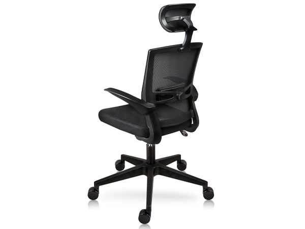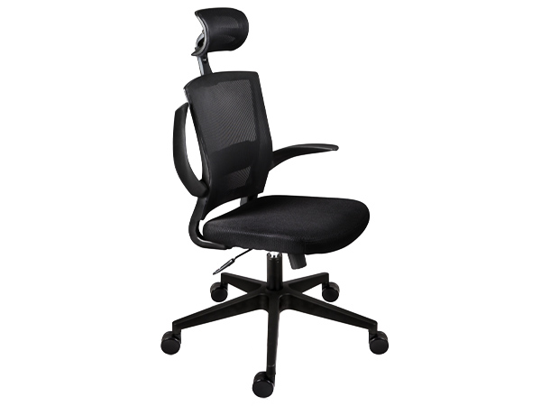 - Cabecera tapizada en malla. Respaldo con almohadilla, lumbar ajustable, brazos plegable a 90° en polipropileno.