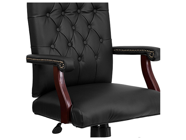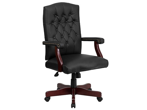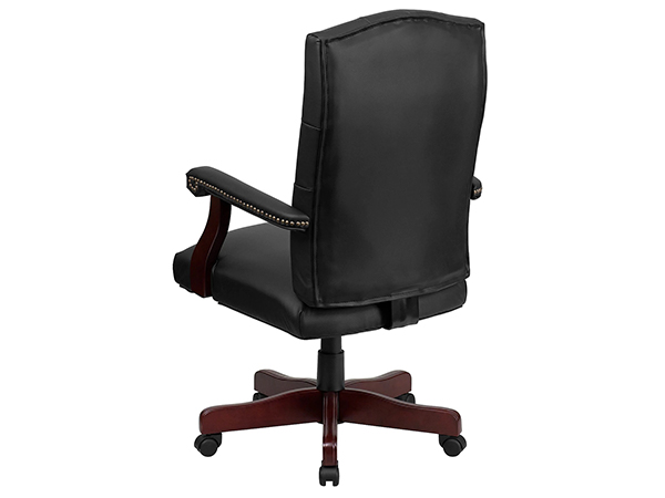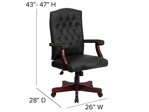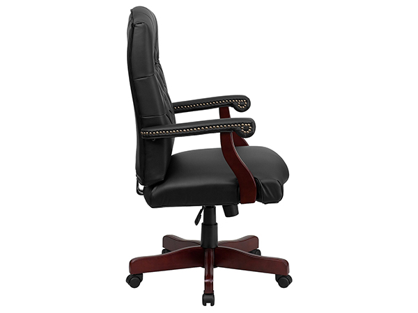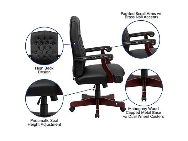 La silla giratoria ejecutiva de cuero negro con acabado de caoba permite el ajuste neumático de la altura del asiento y presenta un diseño de respaldo alto con un cómodo respaldo acolchado.