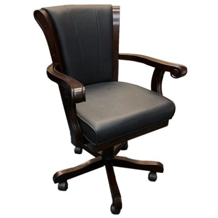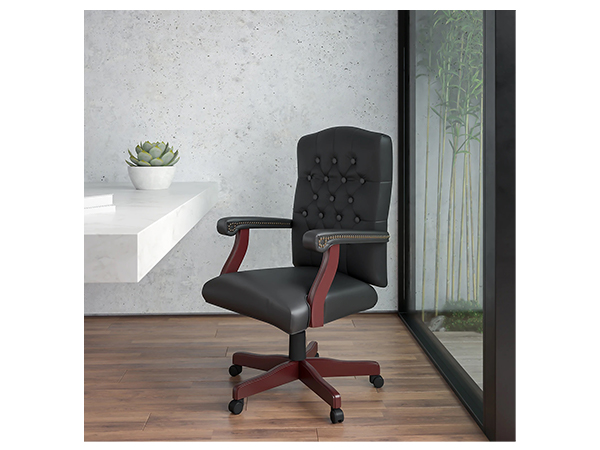 La silla giratoria ejecutiva combina un aspecto tradicional con la comodidad moderna. Los reposabrazos se unen a la silla con soportes para brazos en forma de S, teñidos de caoba. El respaldo arqueado está capitoné en cuero regenerado negro, y la base complementa los soportes para los brazos con su acabado de caoba. El asiento, el respaldo, los apoyabrazos y los apoyabrazos de la silla ejecutiva de oficina están acolchados con espuma de alta densidad y revestidos con material LeatherSoft patentado.