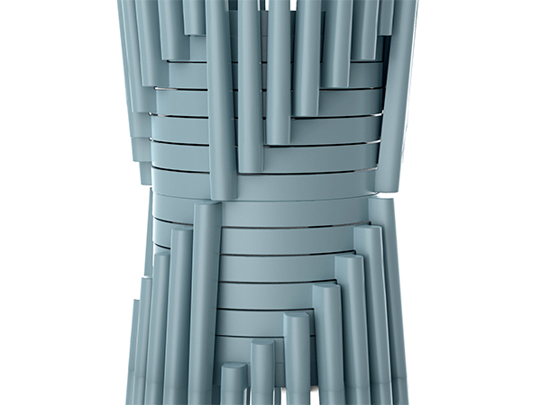 TORRE crea una armonía entre geometrías primitivas, como el círculo, y formas elaboradas, como la serie de curvas que forman el respaldo y las estructuras de soporte.