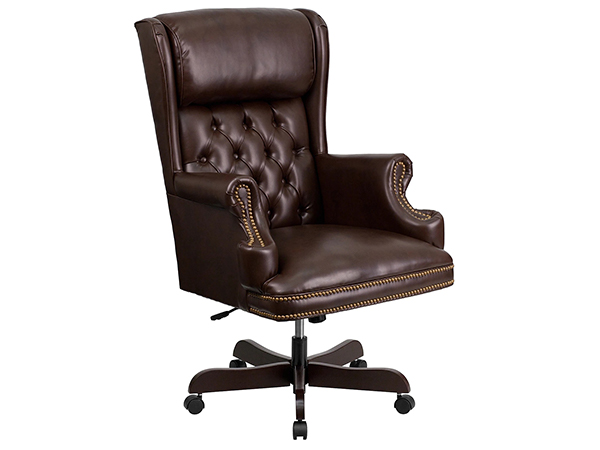 La silla ejecutiva con respaldo alto de cuero marrón, equipada con cómodos brazos fijos, apoya el hombro y el codo.